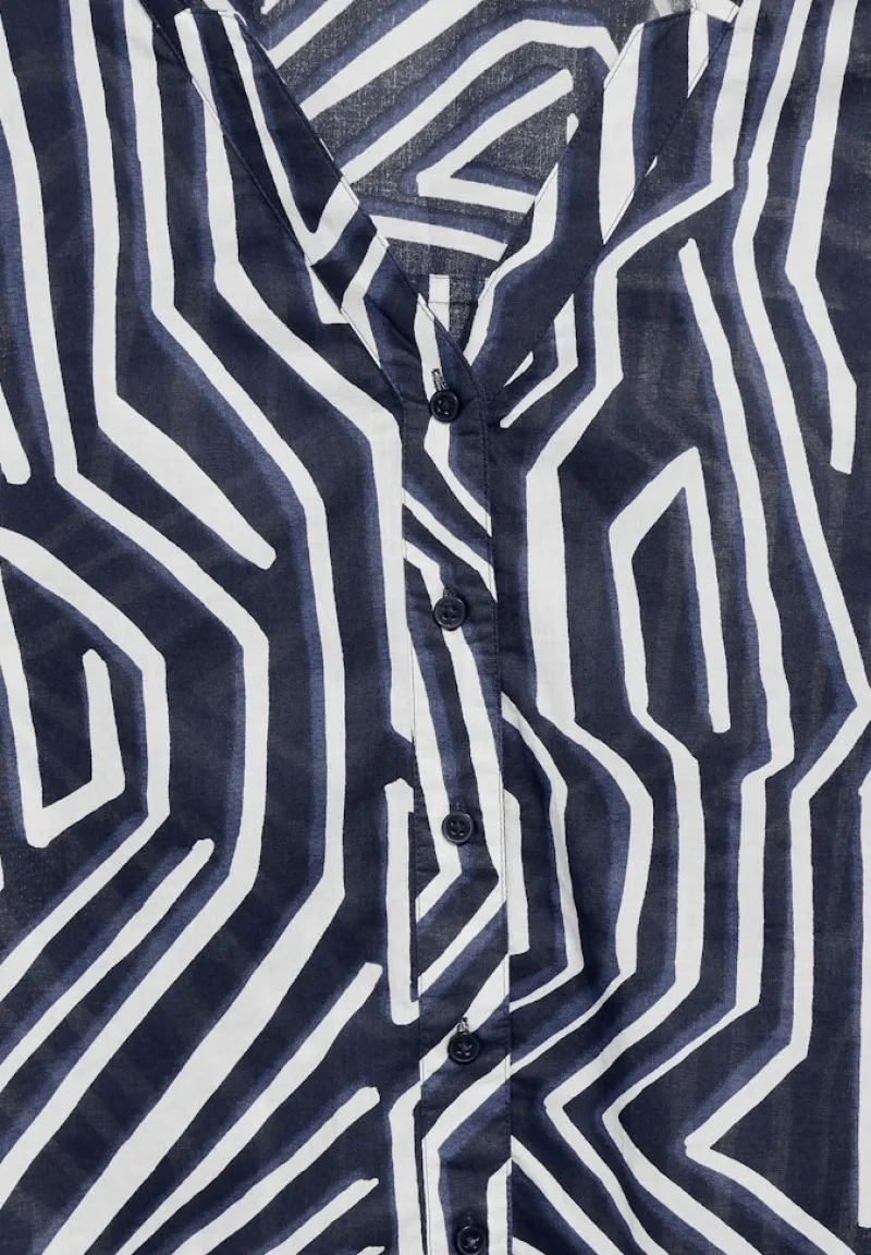 Erlebe den perfekten Mix aus Stil und Komfort mit unserer leichten Baumwollbluse universal blue. Diese Damenbluse besticht durch ihr grafisches Muster und bietet dank des V-Ausschnitts mit Knopfleiste ein elegantes Erscheinungsbild. Die 3/4-Ärmel mit elastischem Saum verleihen der Bluse einen sommerlich-leichten Look, der dich den ganzen Tag über begleitet.