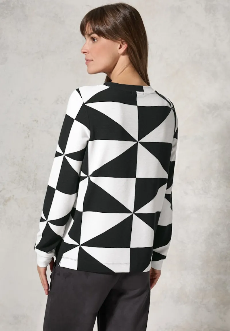 Entdecke das Gemusterte Ottoman Shirt black, das perfekte Kleidungsstück für modebewusste Damen, die Wert auf Stil und Komfort legen. Mit seinem einzigartigen grafischen Muster setzt dieses Shirt trendige Akzente und verleiht deinem Outfit das gewisse Etwas. Der bequeme Rundhalsausschnitt und die langen Ärmel garantieren einen angenehmen Tragekomfort, während die seitlichen Schlitze im Saum für eine lockere Passform sorgen.