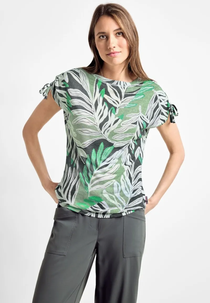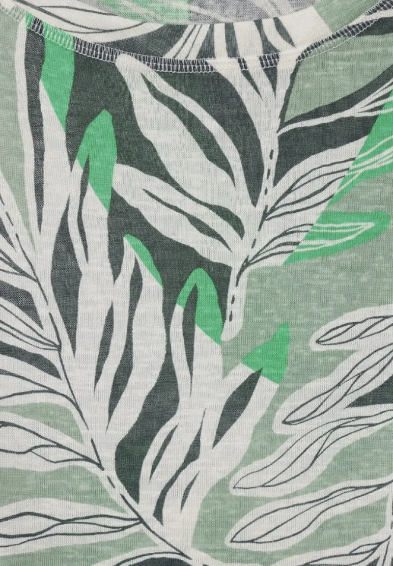 Mit dem T-Shirt in Leinen Optik soft salvia green bringst du Leichtigkeit, Stil und femininen Charme in deinen Alltag. Dieses Print T-Shirt von CECIL begeistert mit einem mehrfarbigen Blätter Print, der natürliche Frische ausstrahlt und an sonnige Tage erinnert. Der moderne U-Boot Ausschnitt und die zarte Raffung am Kurzarm setzen dezente, aber wirkungsvolle Akzente, die deine Silhouette vorteilhaft umspielen.