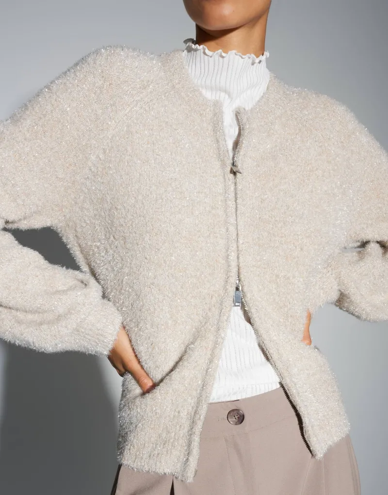 Entdecke die Dosmic ivory – eine anschmiegsame Strickjacke für Damen mit lockerer Passform und geradem Schnitt. Dieses Modell besticht durch verkürzte Länge, lange Ärmel und einen modischen Blousonkragen. Die Rückenlänge beträgt ca. 54 cm bei Größe 36 (Modelgröße 177 cm trägt Größe 36). Gefertigt aus flauschigem Effektgarn bietet die Strickjacke einen extrem weichen Griff, ist elastisch, wärmend und verfügt über Strickbündchen sowie einen praktischen Zwei-Wege-Reißverschluss. Material: 35% Polyacryl, 35% Polyester, 28% Polyamid, 2% Elasthan. Geeignet für Damen, die Wert auf Komfort, Style und Vielseitigkeit legen.