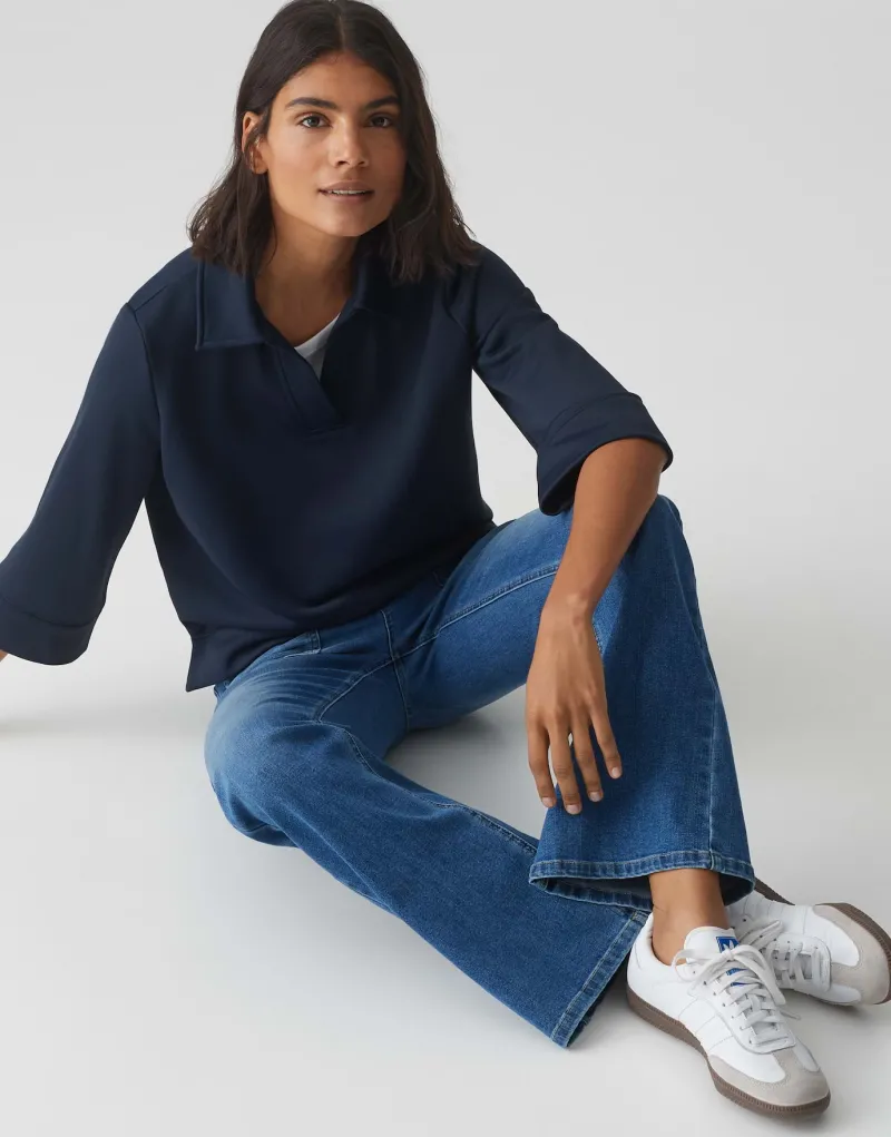 - Ausschnitt: V-Ausschnitt kombiniert mit einem eleganten Polokragen