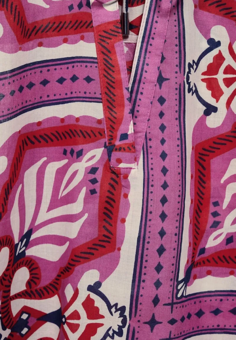 Unsere Print Tunika Bluse besteht aus 100% hochwertiger Baumwolle, die für ihre Atmungsaktivität und Weichheit bekannt ist. Das strapazierfähige Material sorgt dafür, dass die Bluse auch bei häufigem Tragen und Waschen ihre Form und Farbe behält.