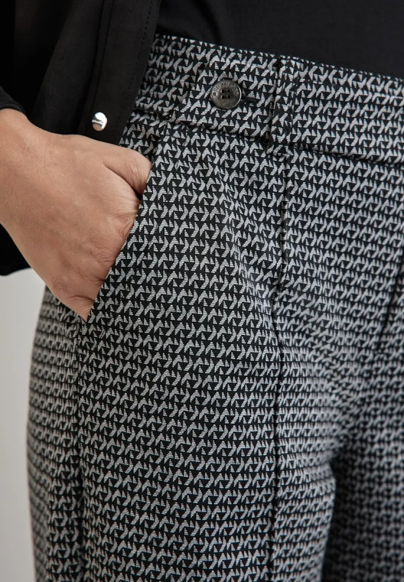 Die Jaquard-Hose black ist das perfekte Kleidungsstück für alle, die stilvolle und komfortable Mode schätzen. Mit ihrem eleganten Jacquard-Muster und der figurnahen Passform setzt diese Hose modische Akzente und sorgt gleichzeitig für ein angenehmes Tragegefühl.