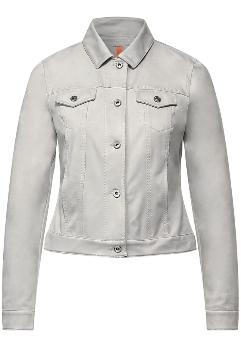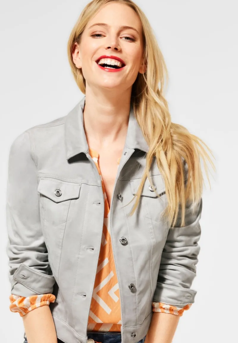 Just for you! Die Kurze Veloursjacke sky grey von Street One überzeugt mit softem Fake Veloursleder und einem modernen, sportlichen Schnitt. Dank seitlicher Eingrifftaschen und praktischen Brusttaschen vereint diese Damenjacke Style und Funktionalität. Knopfleiste und definierter Ärmelsaum runden den Look ab – perfekt als Indoor Jacke oder für lässige Looks an kühleren Tagen.