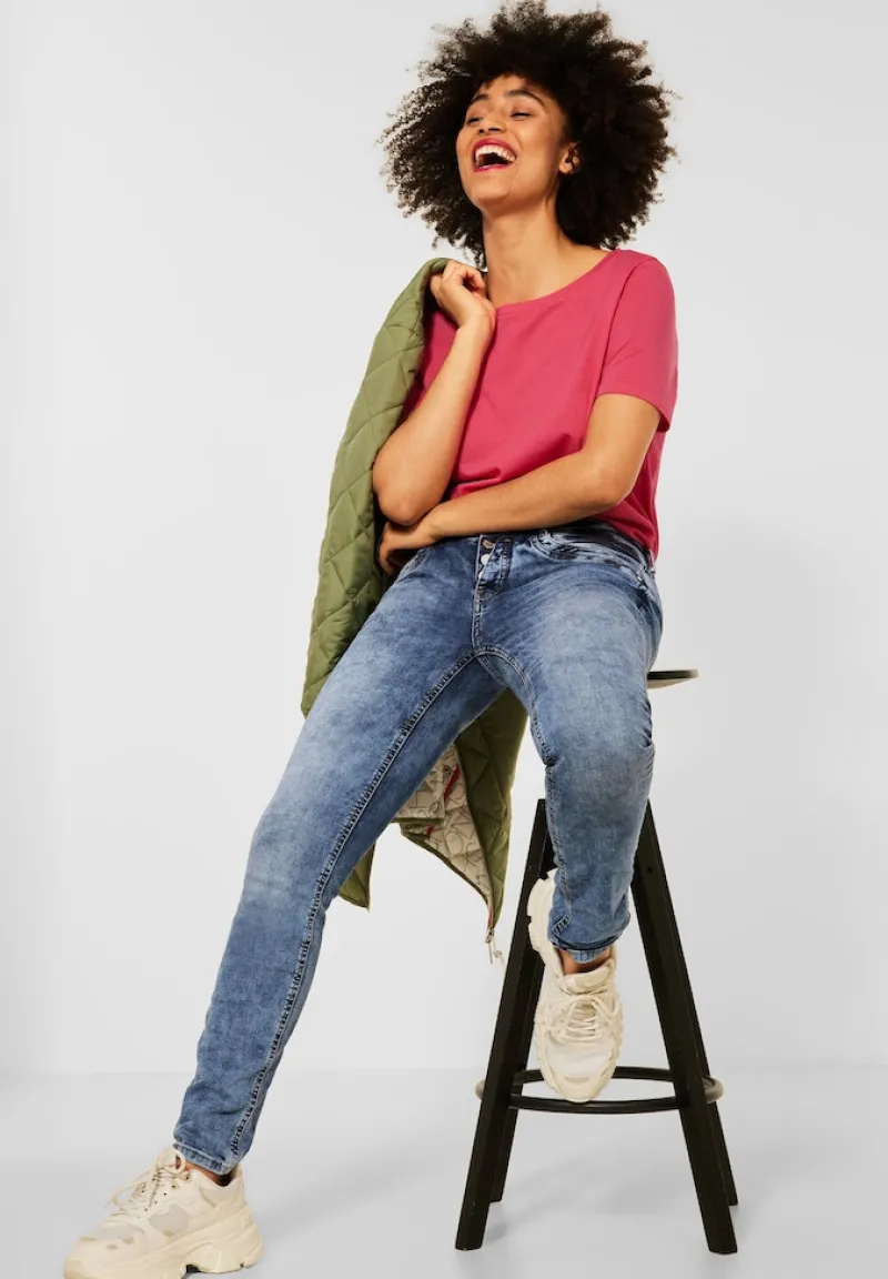 Denim-Star für dein Outfit: Die Casual Fit Jeans ist ein vielseitiges Fashion-Piece von Street One, das sich perfekt in deinen Alltag integriert. Als Jeans Damen Modell kombiniert sie bequemen Sitz mit femininer Silhouette durch Low Waist und Slim Legs. Der markante 4-Knopf-Verschluss setzt ein rockiges Statement ohne auf Komfort zu verzichten.