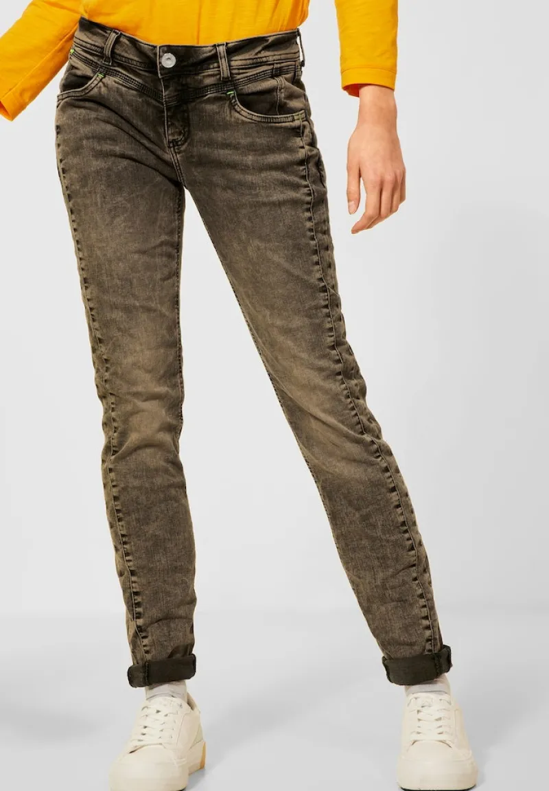 Deine neue Lieblingsjeans: Lässige Casual Fit Jeans im Style Jane von Street One. Die Middle Waist mit Slim Legs kombiniert sportliche Details wie Reißverschluss mit Knopf und einen legeren 4-Pocket Style mit einer ausgefallenen, dunklen Waschung im Used-Look. Der Mix aus hochwertiger Baumwolle und Stretch sorgt für Komfort und Formstabilität — ideal für deinen Alltag, Office-Looks oder entspannte Wochenenden.