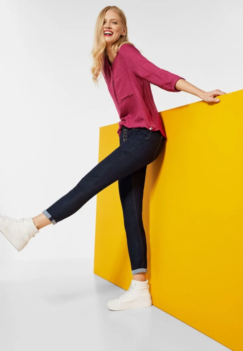 Entdecke die perfekte Mischung aus Komfort und Stil mit unserer Casual Fit Jeans im angesagten Momenthemaus von Street One. Diese Damenjeans mit hohem Bund und schmal zulaufenden Beinen bietet nicht nur eine feminine Passform, sondern auch einen modernen Look, der durch praktische Eingriffstaschen und einen klassischen 5-Knopf-Verschluss abgerundet wird.