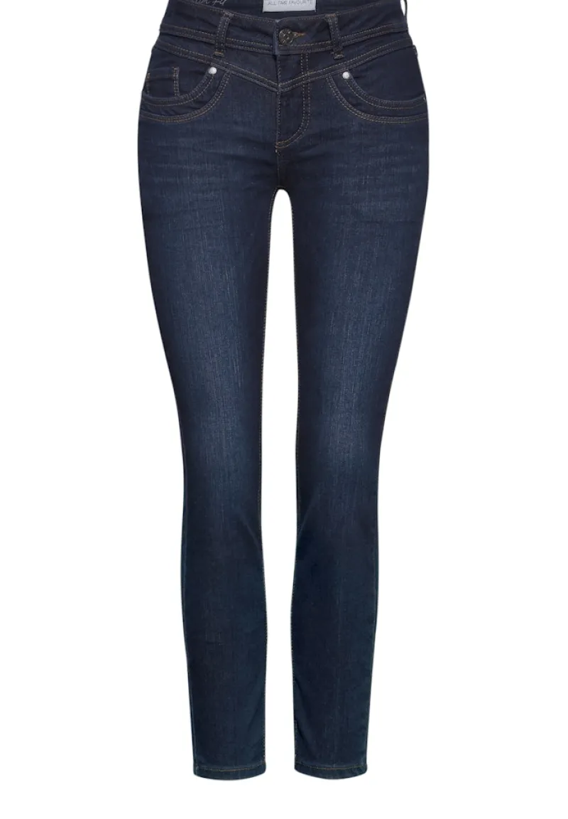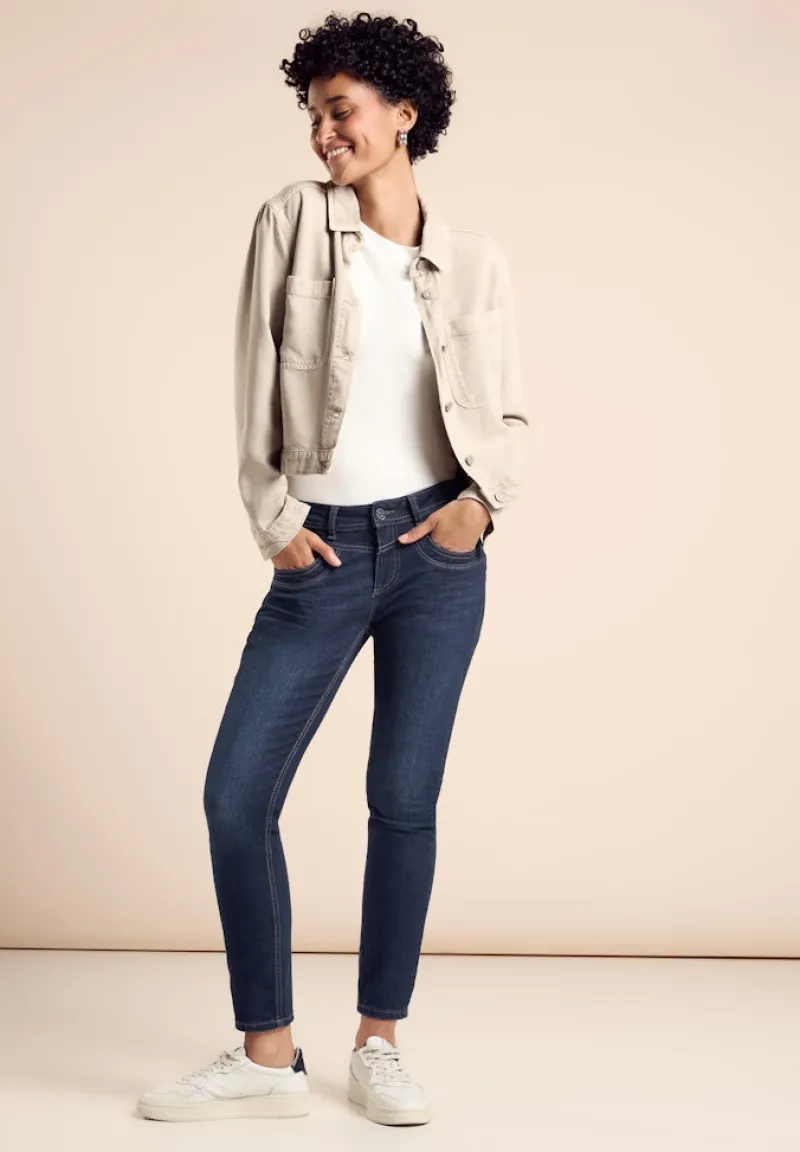 Entdecke die perfekte Kombination aus zeitlosem Stil und modernem Komfort mit unserer Jeans im Slim Fit deep indigo washed. Dieses unverzichtbare Basic für Damen vereint Eleganz und Lässigkeit und passt sich nahtlos deinem Alltag an.