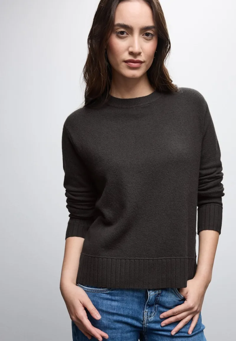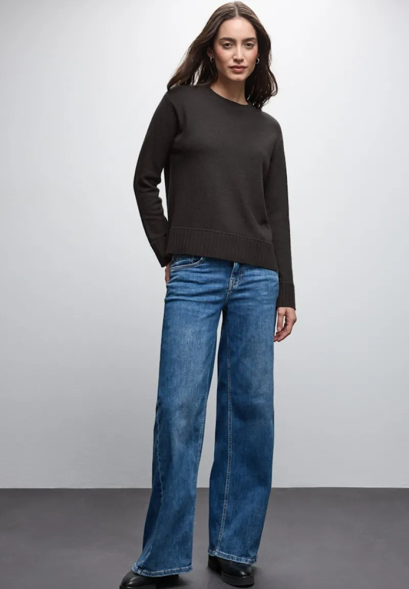 Mit seinem klassischen Rundhalsausschnitt und den seitlichen Schlitzen vereint dieser Pullover Eleganz und Funktionalität. Er ist die perfekte Ergänzung für jede Garderobe und lässt sich mühelos mit Jeans, Röcken oder eleganten Hosen kombinieren.