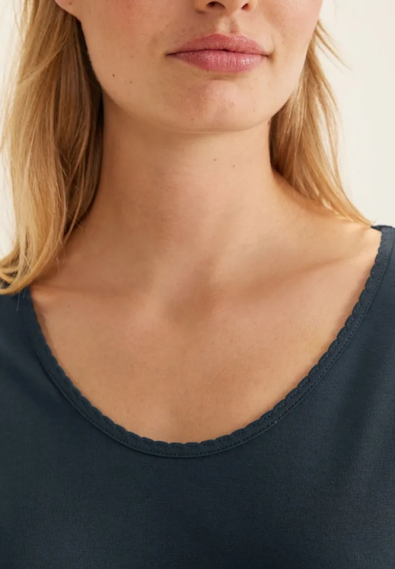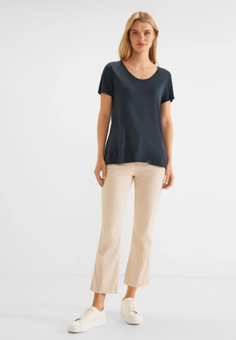 Unser Shirt mit Dekosaum wird aus 100% Livaeco Viskose gefertigt, einem nachhaltigen Material, das aus natürlichen Rohstoffen hergestellt wird. Die weiche und atmungsaktive Textur sorgt für ein angenehmes Tragegefühl den ganzen Tag über. Zudem ist das Material pflegeleicht und behält auch nach zahlreichen Wäschen seine Form und Farbe.