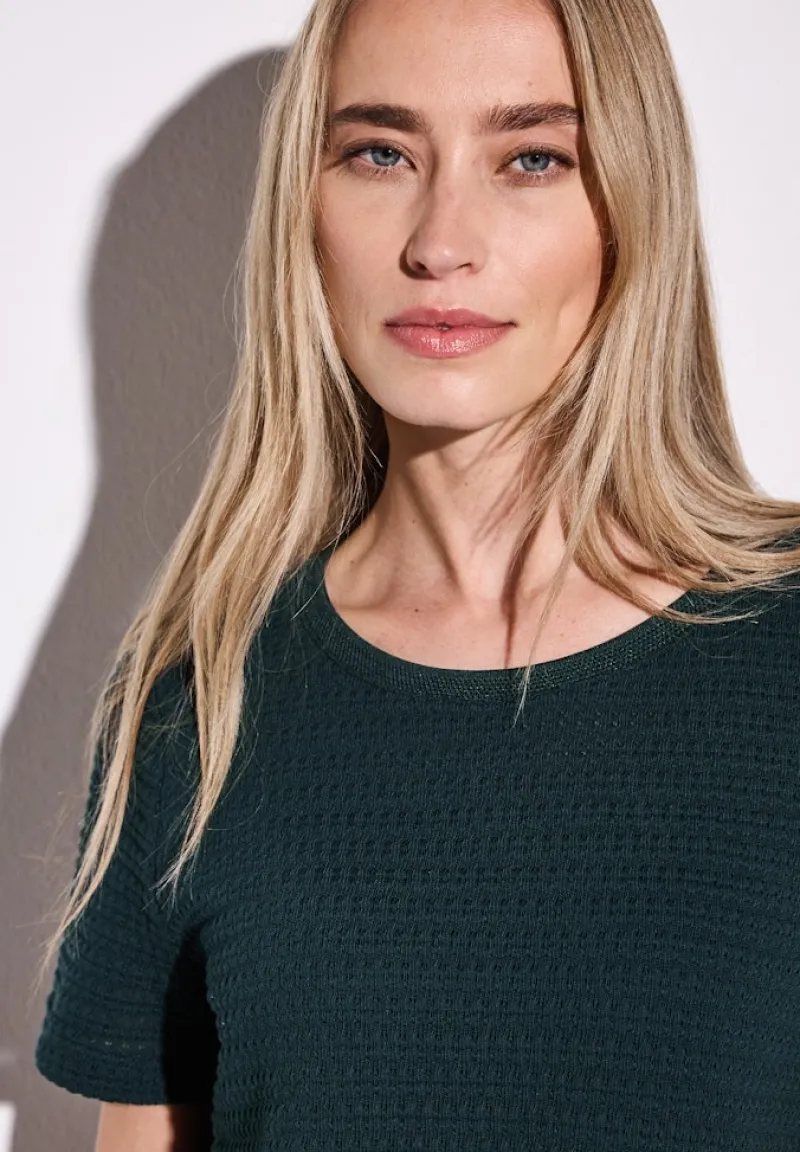 Dieses Strick-Look T-Shirt für Damen begeistert mit seinem einzigartigen Strukturmuster und den seitlichen Schlitzen im Saum. Hergestellt aus 100% reiner Baumwolle, bietet es ein angenehmes Tragegefühl und verleiht deinem Outfit einen lässigen, modischen Touch.
