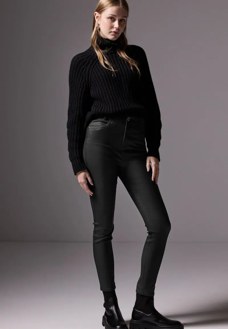 Entdecke die beschichtete Hose, die mit ihrem trendigen Leder-Look und der figurbetonten Passform jeden Look aufwertet. Der High Waist Schnitt und die Slim Legs sorgen für eine feminine Silhouette, während der Stretchanteil höchsten Tragekomfort garantiert. Ein modisches Highlight, das in keinem Kleiderschrank fehlen sollte.