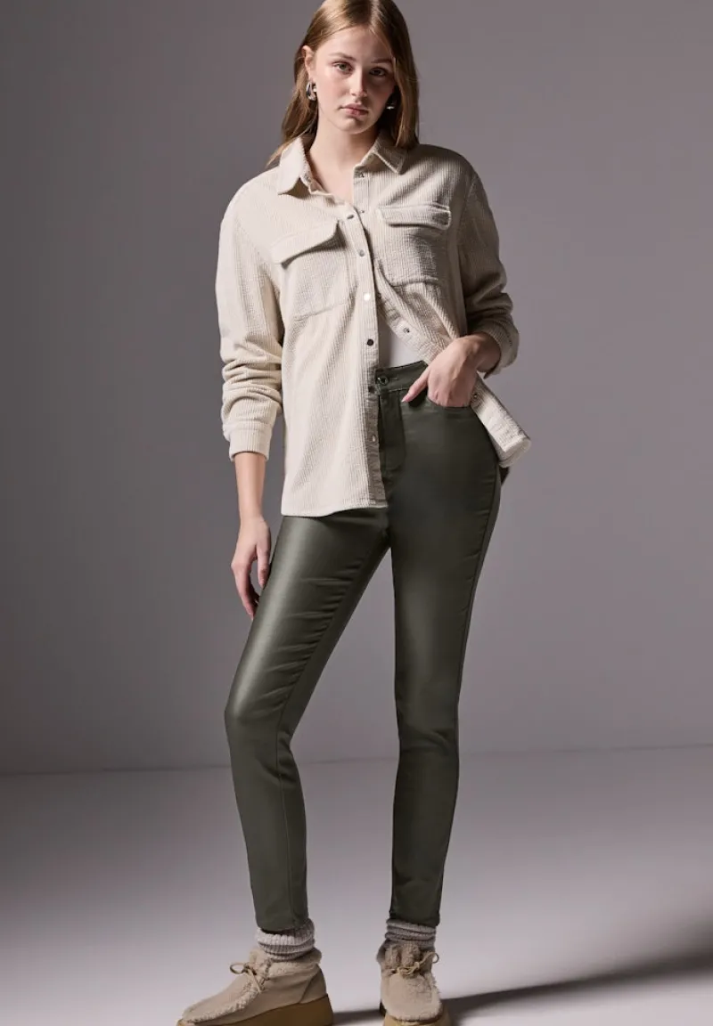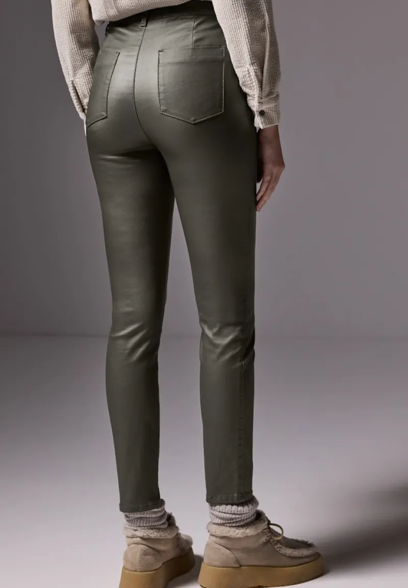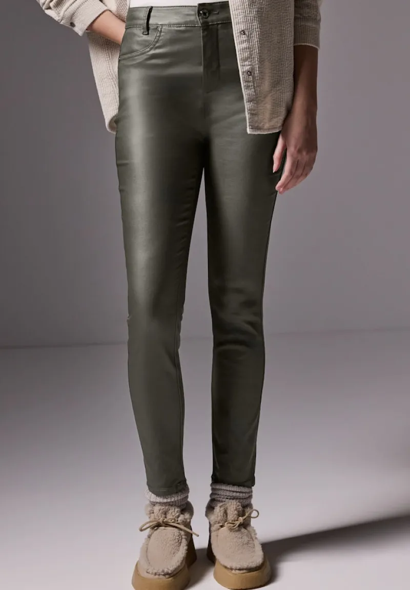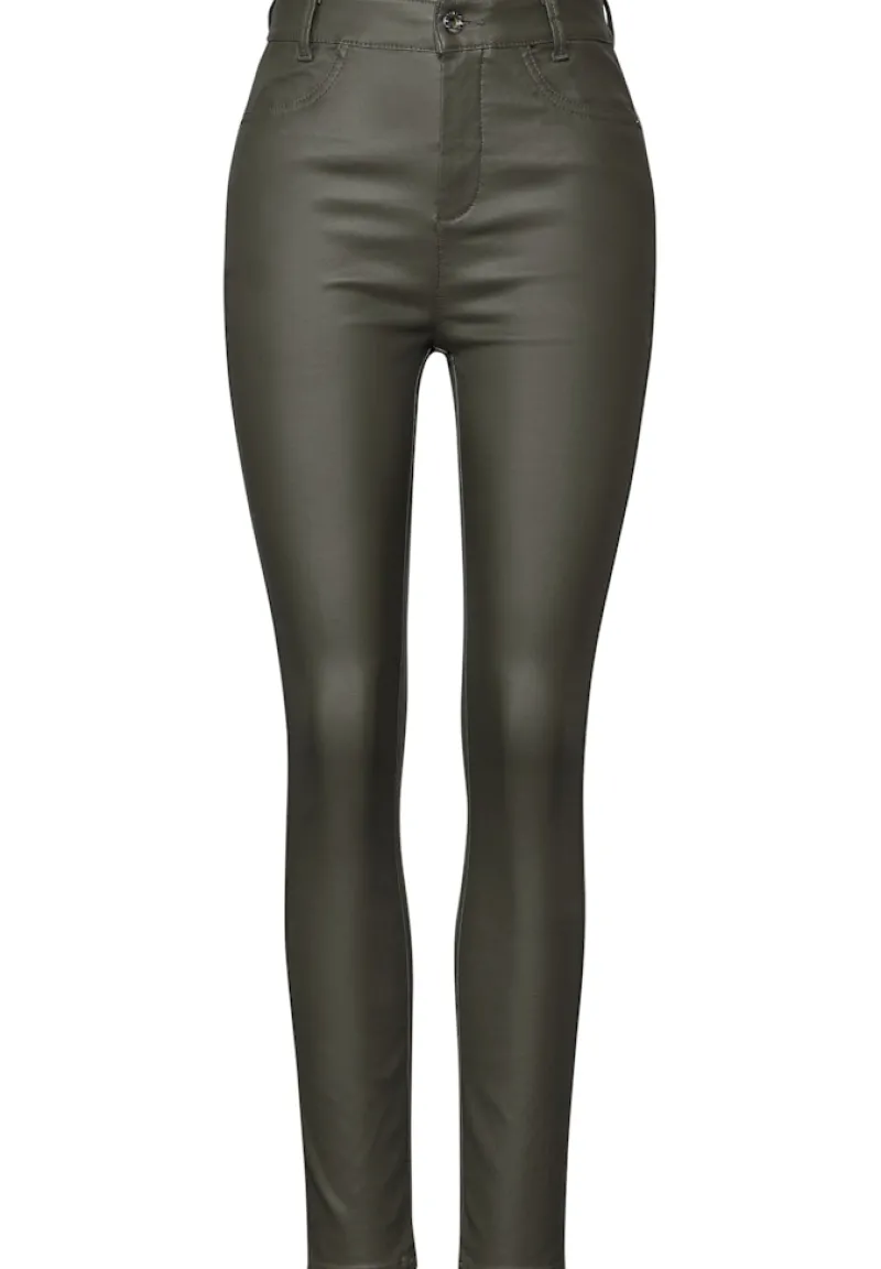 Entdecke die beschichtete Hose, die mit ihrem trendigen Leder-Look und der figurbetonten Passform jeden Look aufwertet. Der High Waist Schnitt und die Slim Legs sorgen für eine feminine Silhouette, während der Stretchanteil höchsten Tragekomfort garantiert. Ein modisches Highlight, das in keinem Kleiderschrank fehlen sollte.