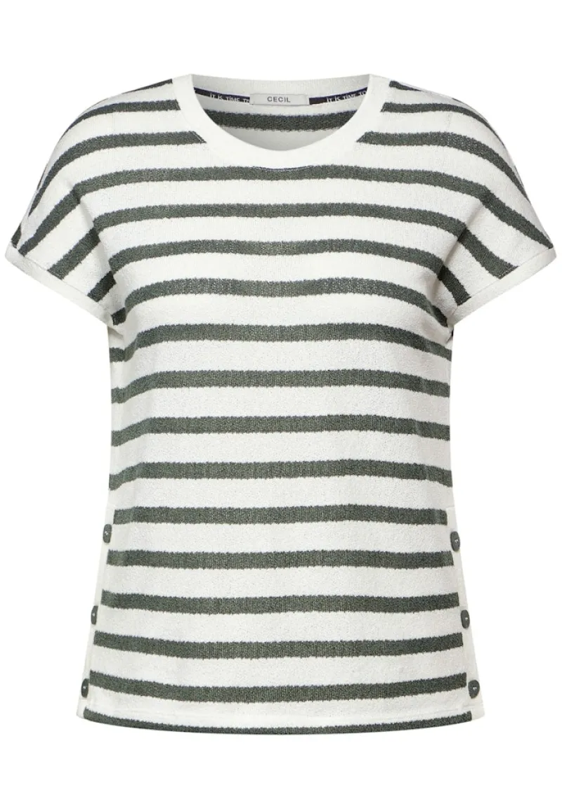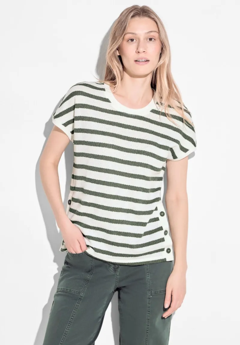 Unser gestreiftes T-Shirt für Damen überzeugt mit einem klassischen Rundhalsausschnitt und einer crepigen, groben Jerseyware, die für einen modernen und zugleich bequemen Look sorgt.