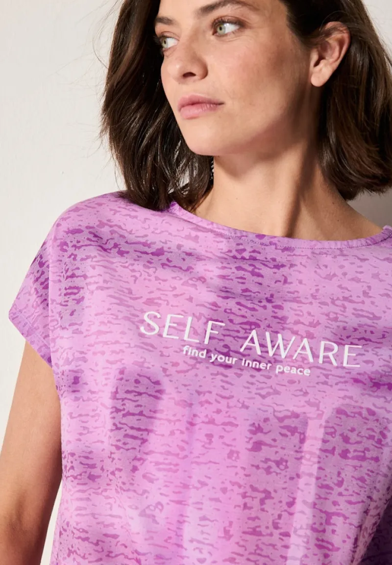 Das leichte T-Shirt besticht durch eine trendige Ausbrenner-Optik und einen auffälligen Wording-Print. Der lässige U-Boot-Ausschnitt sowie der Tunnelzug am Saum sorgen für eine entspannte Silhouette, die sich ideal deinem individuellen Stil anpasst.