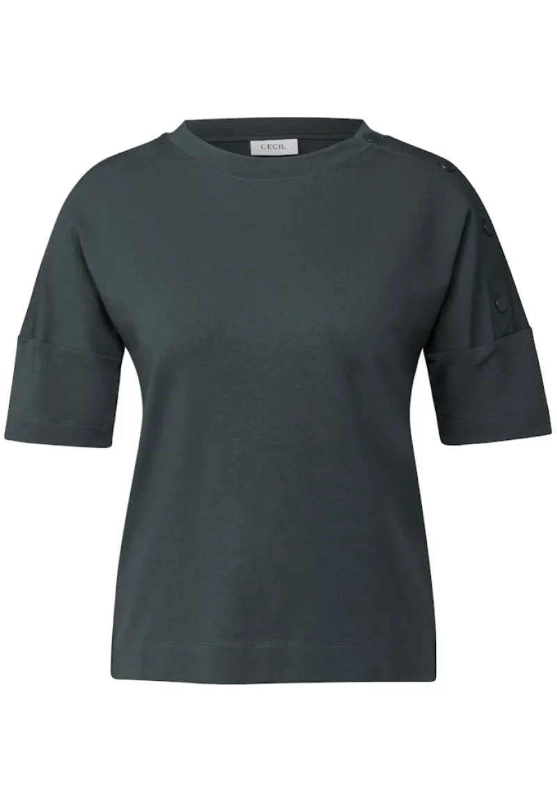 Entdecke das T-Shirt mit Knopfdetail slate khaki, das mit einem modischen Knopfdetail an der Schulter Akzente setzt. Der Rundhalsausschnitt und der angenehme Baumwollmix mit Stretchanteil sorgen für einen bequemen Sitz – perfekt für deinen Alltag.