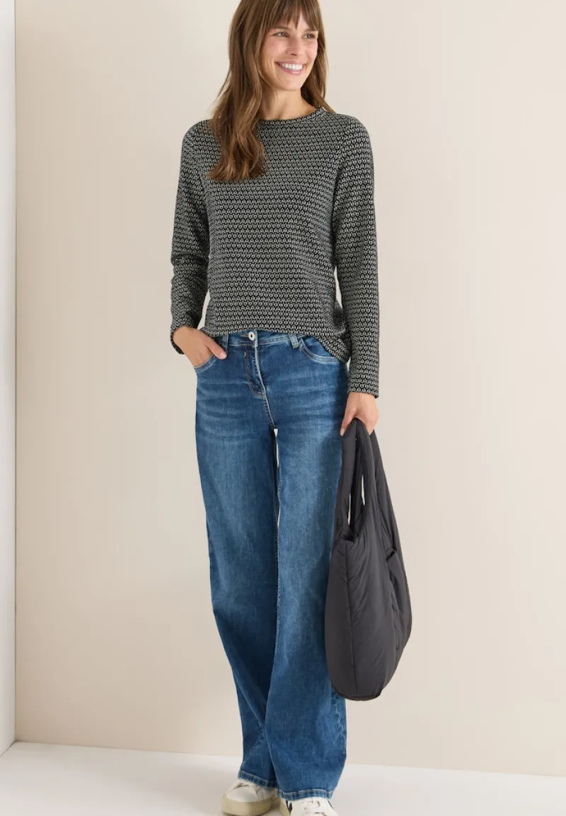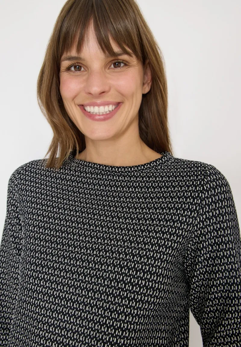 Das Two-Tone Strukturshirt für Damen besticht durch ein feines Strukturmuster und eine dezente Farbgebung. Der U-Boot-Ausschnitt sowie die langen Ärmel unterstreichen den femininen Look und machen es zum perfekten Begleiter für stilvolle Alltagsoutfits mit hohem Wohlfühlfaktor.