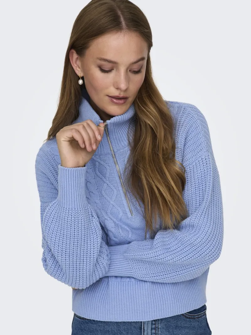 Der Strickpullover ist normal geschnitten und bietet eine angenehme Passform, die weder zu eng noch zu locker sitzt. Das hochgeschlossene Design in Kombination mit einem halben Reißverschluss verleiht dir Flexibilität beim Styling und hält dich zugleich warm.