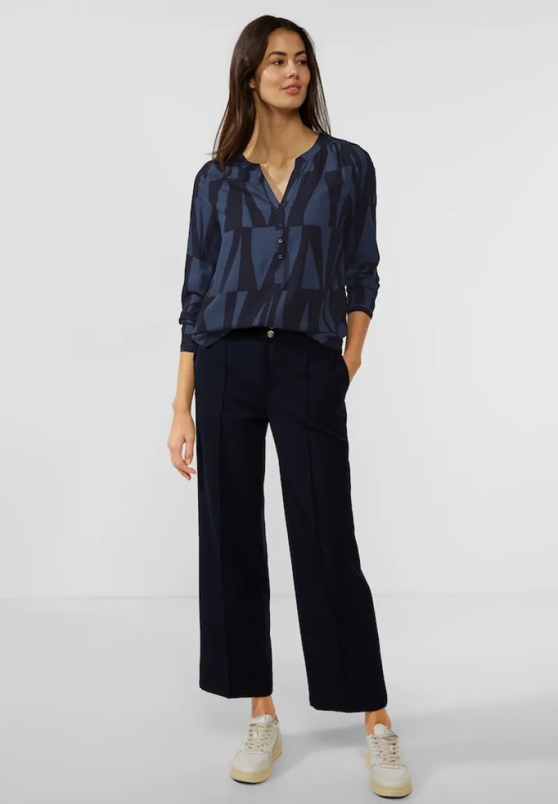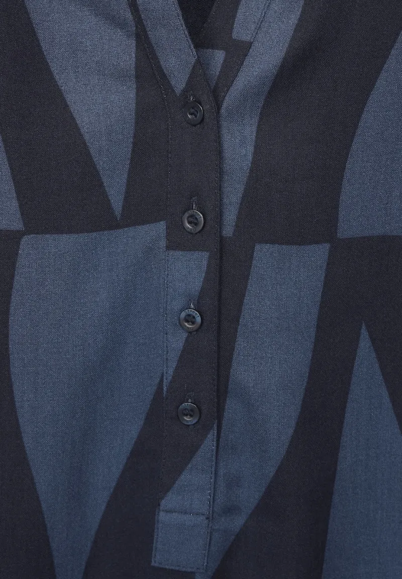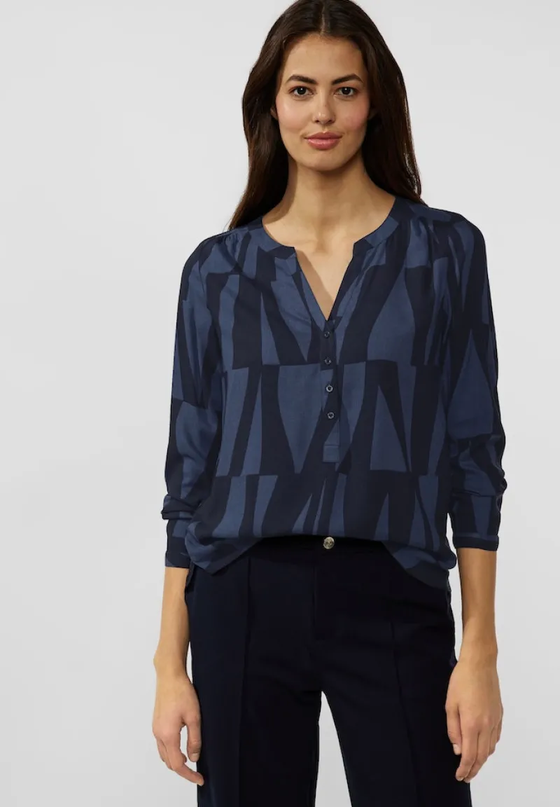 Effortless elegance! Die Street One Damenbluse im Style Bamika mit geschlitztem Rundhalsausschnitt und halber Knopfleiste ist die perfekte Wahl für Freizeit und Büro. Mit diesem bequemen It-Piece bist du immer gut gekleidet. Ein echter Hingucker ist der grafische Wellenprint, der deiner Garderobe eine moderne Note verleiht.