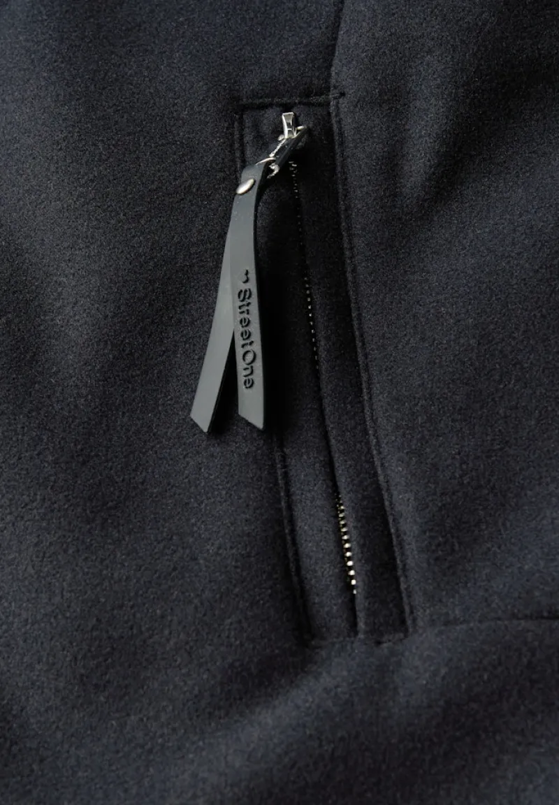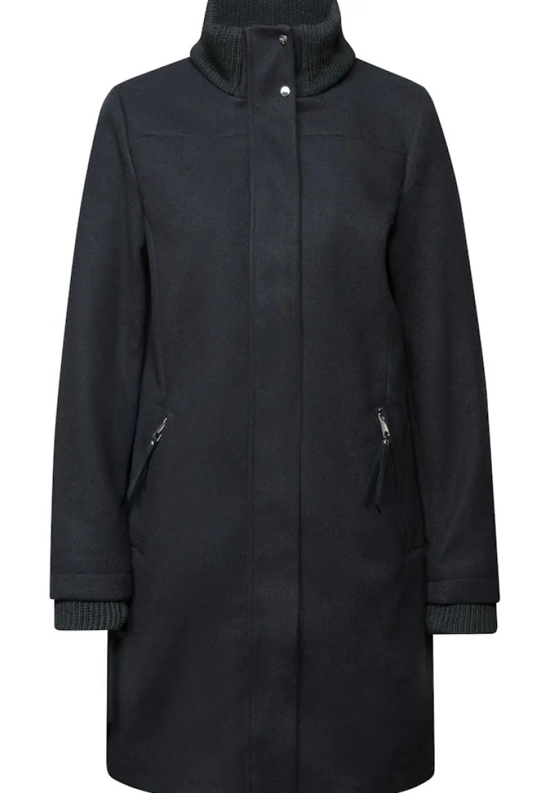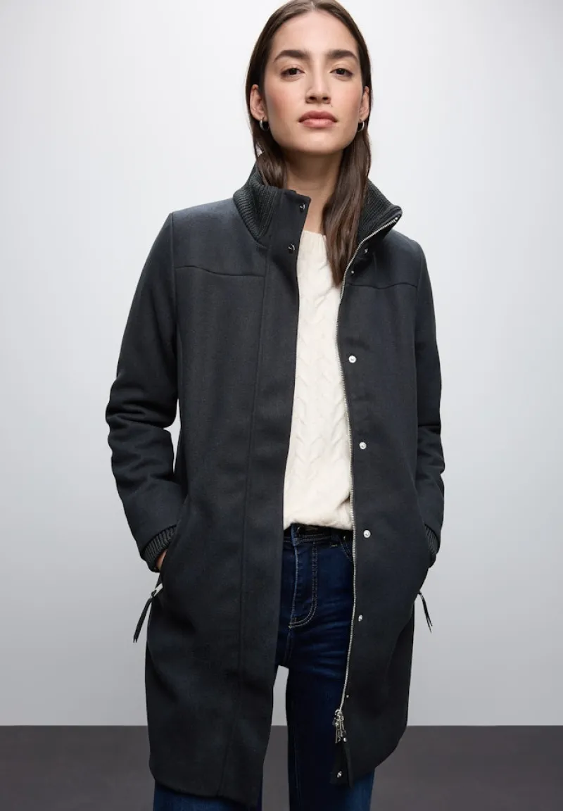 - Stehkragen mit Strickdetails: Eleganter Schutz vor dem Wind.