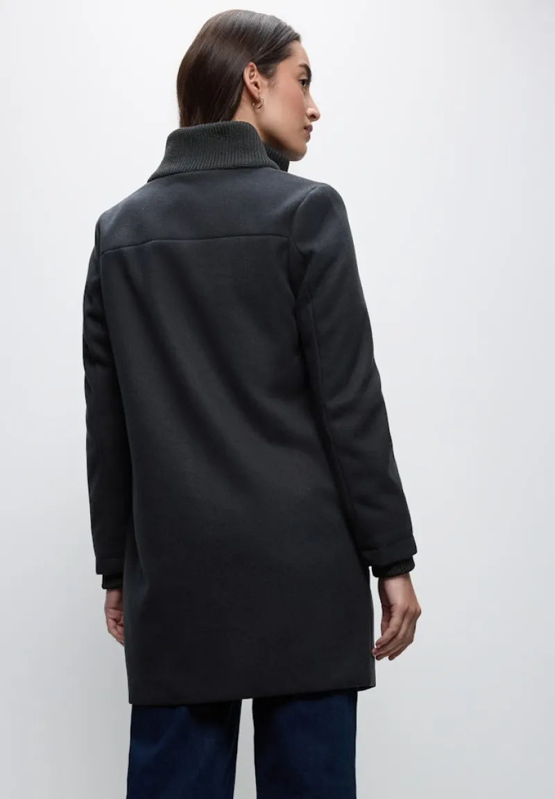 Der Damenmantel überzeugt durch seinen Stehkragen aus Strickqualität, der nicht nur schützt, sondern auch einen modischen Akzent setzt. Die durchgehende Knopfleiste sorgt für einen sicheren Verschluss und unterstreicht das elegante Design.