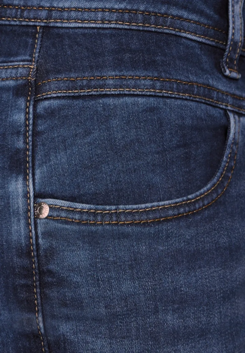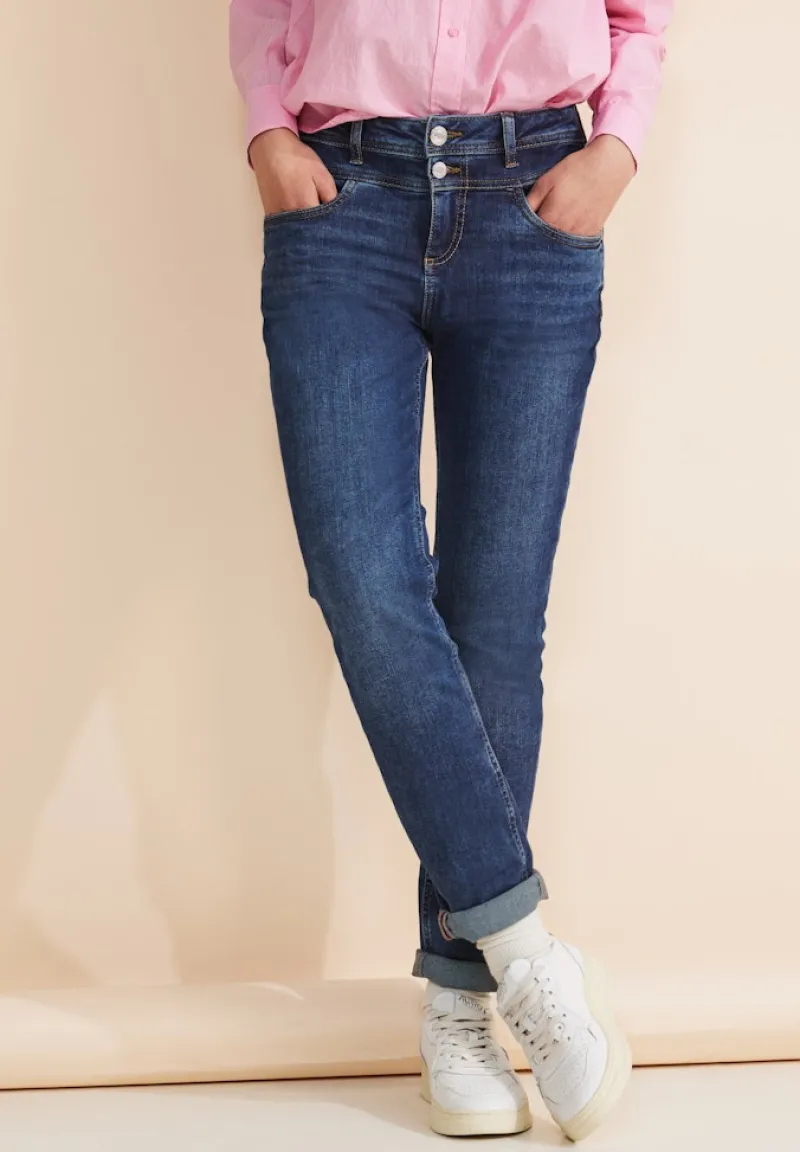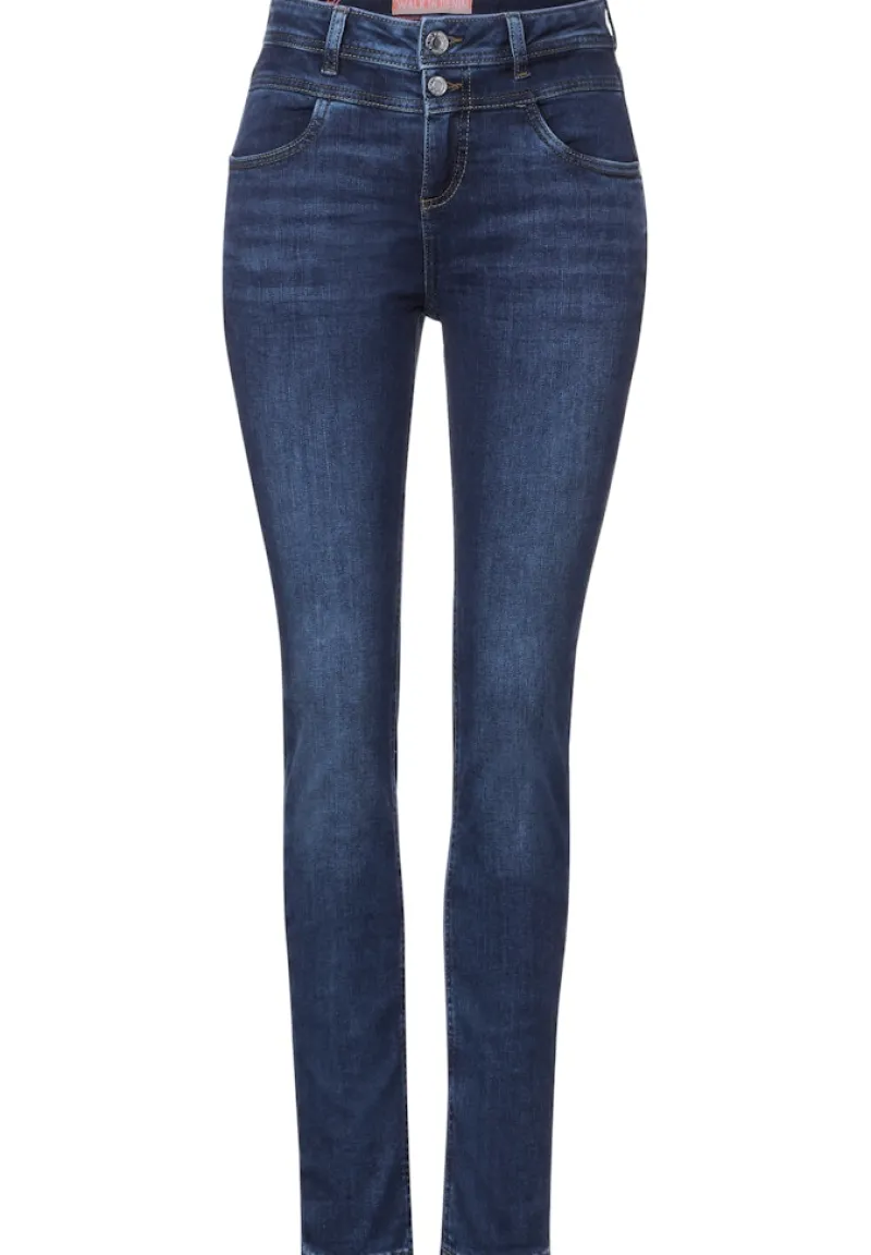 Entdecke die Casual Fit indigo Jeans mid indigo random wash – eine Street One Damenjeans im Casual Fit mit High Waist und Slim Leg, die modernen Look und hohen Tragekomfort vereint. Diese Jeans besticht durch praktische Eingrifftaschen, einen doppelten Knopfverschluss und eine trendige blaue Waschung. Dank des stretchfreundlichen Materials sitzt sie bequem, formstabil und begleitet dich zuverlässig im Alltag.