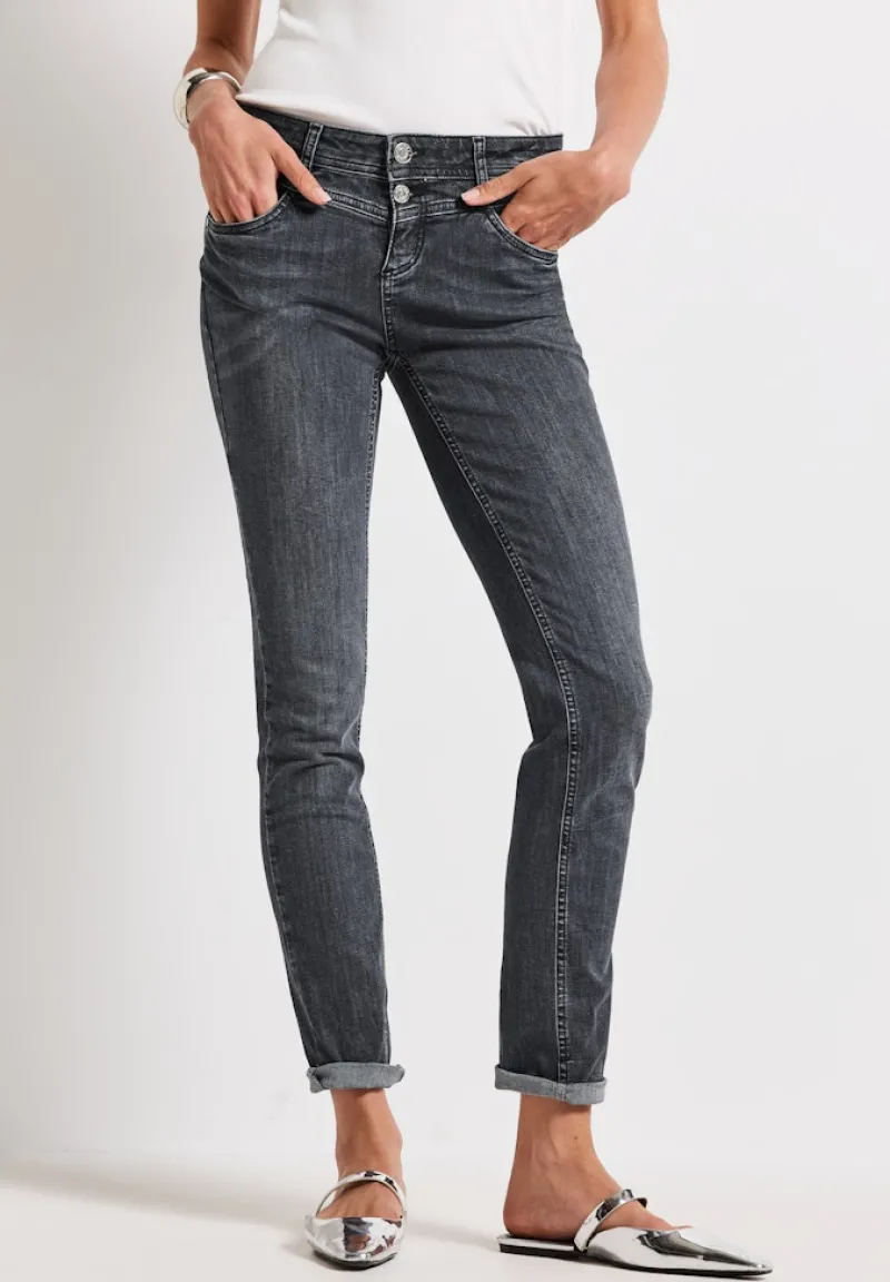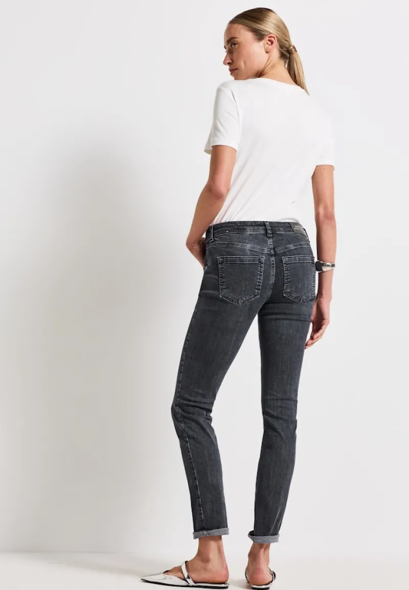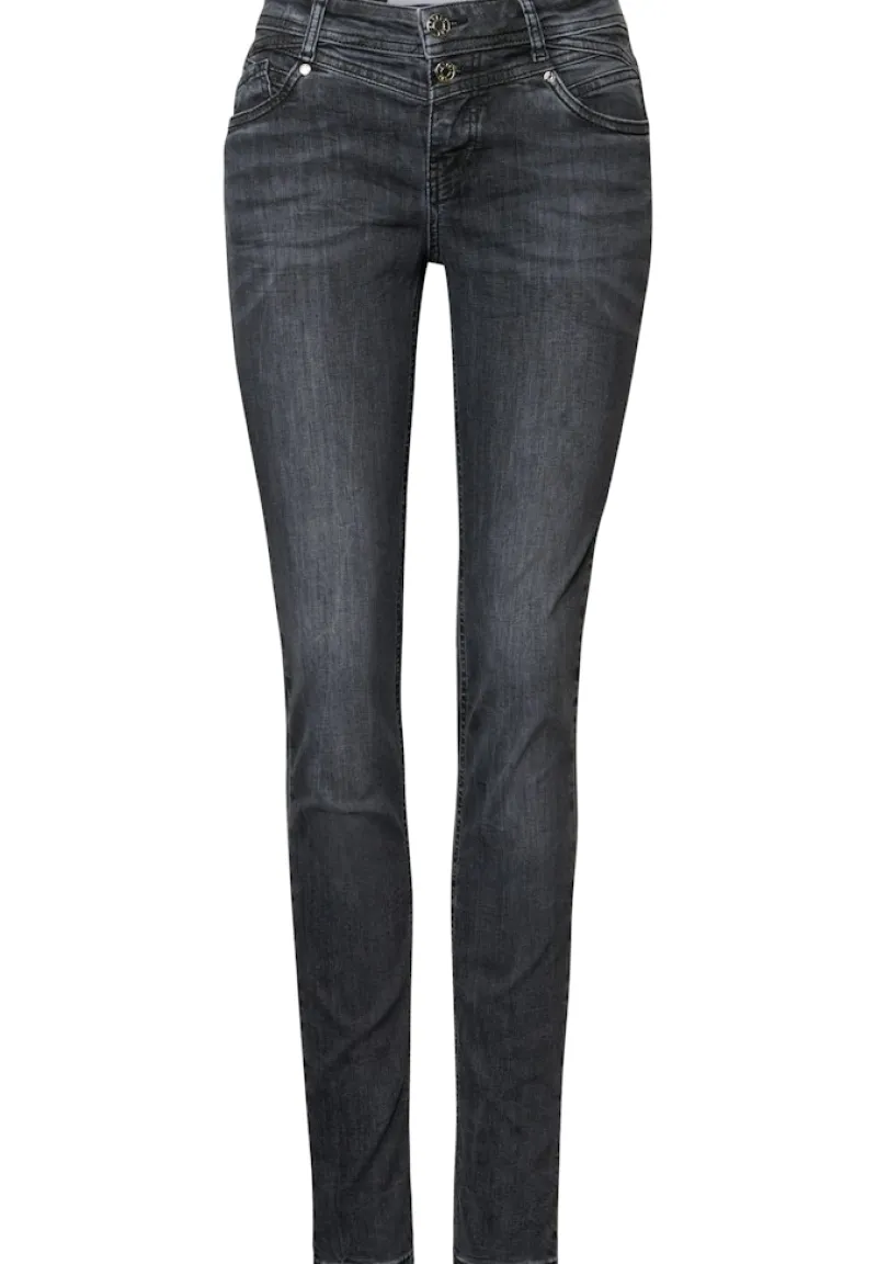 Die Casual Fit Jeans im Style Jane von Street One verbindet contemporary Design mit hohem Tragekomfort. Du bekommst eine Mid Waist Jeans mit Slim Legs, die durch eine moderne graue Waschung überzeugt und sich als vielseitiger Allrounder für den Alltag beweist. Der klassische 5-Pocket-Style und der elastische Baumwollmix machen diese Jeans zur perfekten Wahl für Freizeit, Büro oder entspannte Wochenenden.