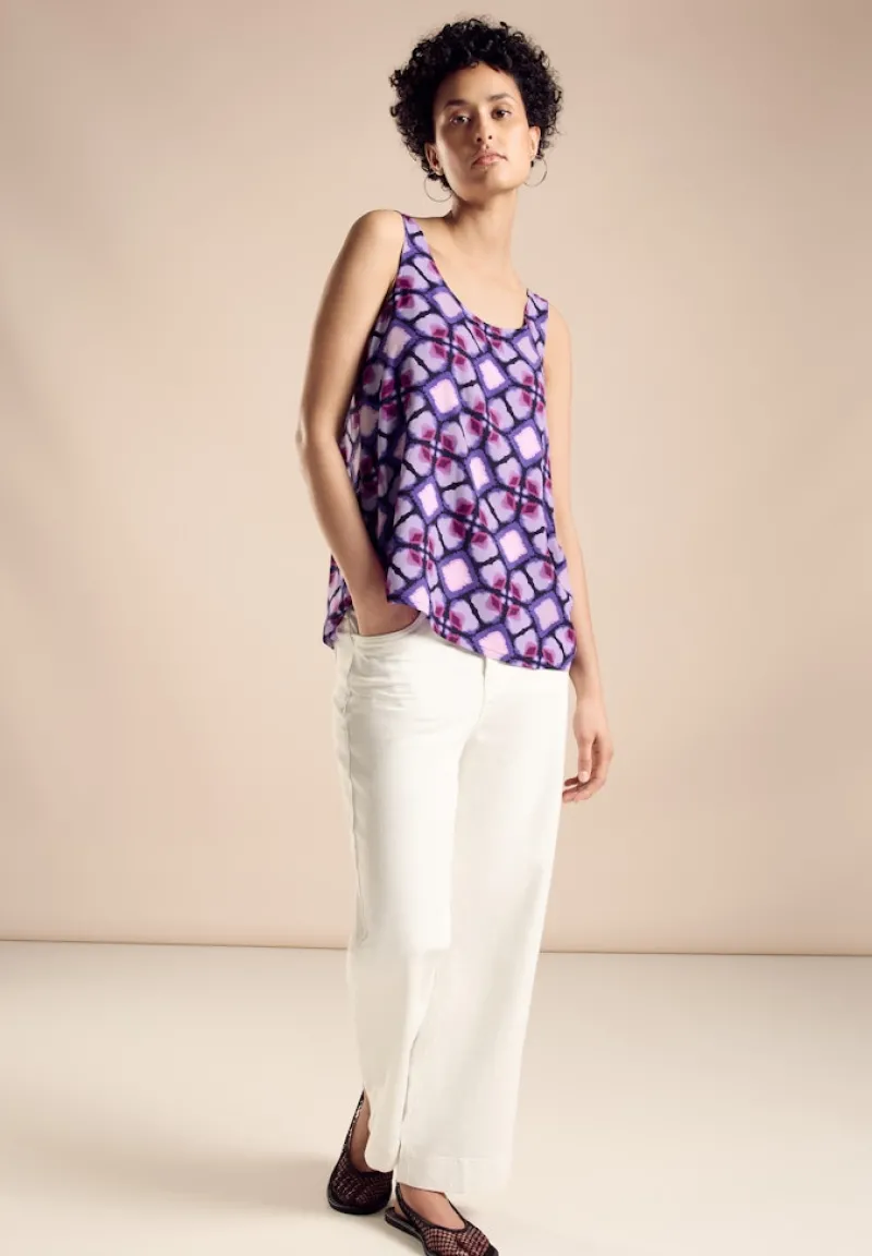 Der auffällige Print in violett-blau macht dieses Blusentop zu einem echten Hingucker. Das moderne Design lässt sich vielseitig kombinieren und passt zu verschiedenen Anlässen, sei es im Büro, beim Treffen mit Freunden oder am Wochenende.