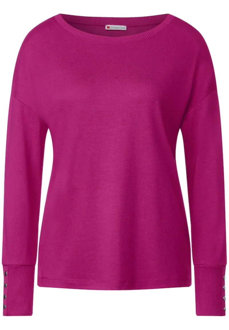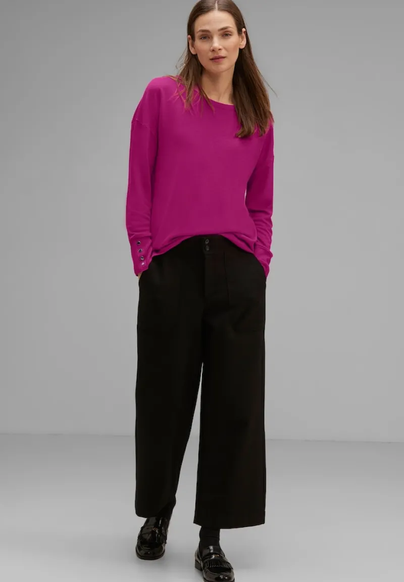 Mit seinem femininen Schnitt und den eleganten Knopfdetails setzt das Shirt modische Akzente. Der klassische Rundhalsausschnitt und die schmalen Ärmel sorgen für einen zeitlosen Look.