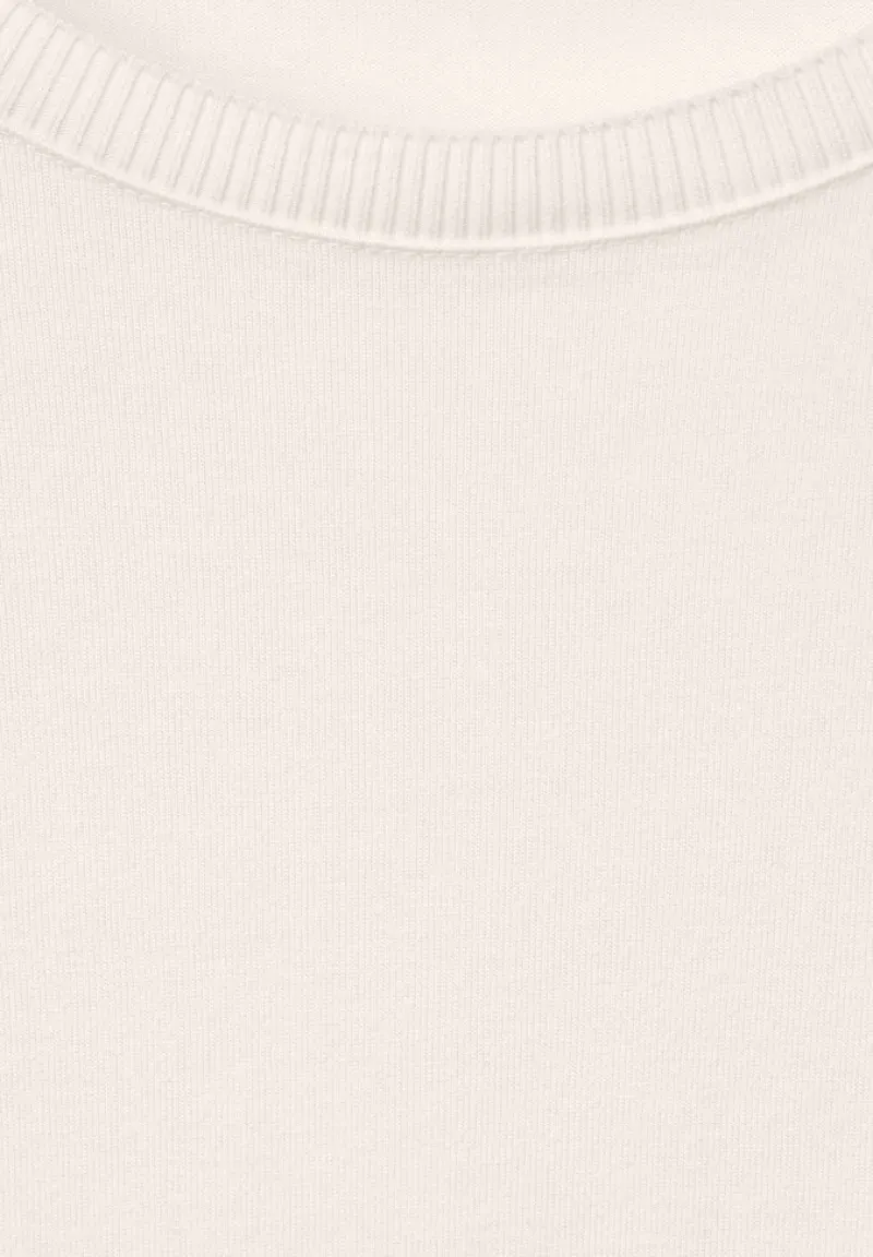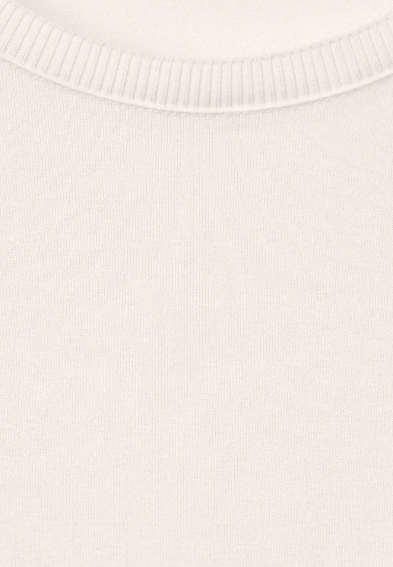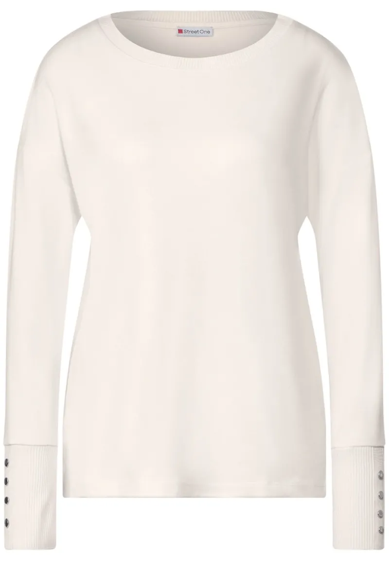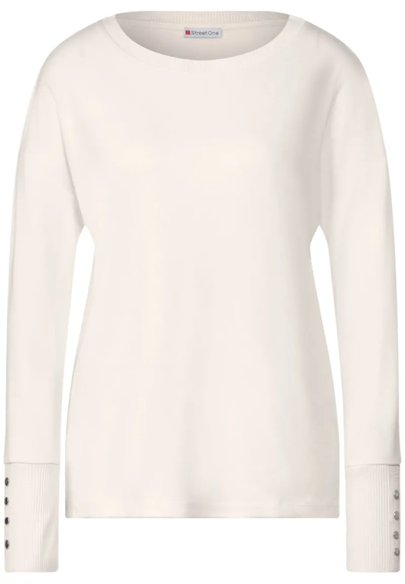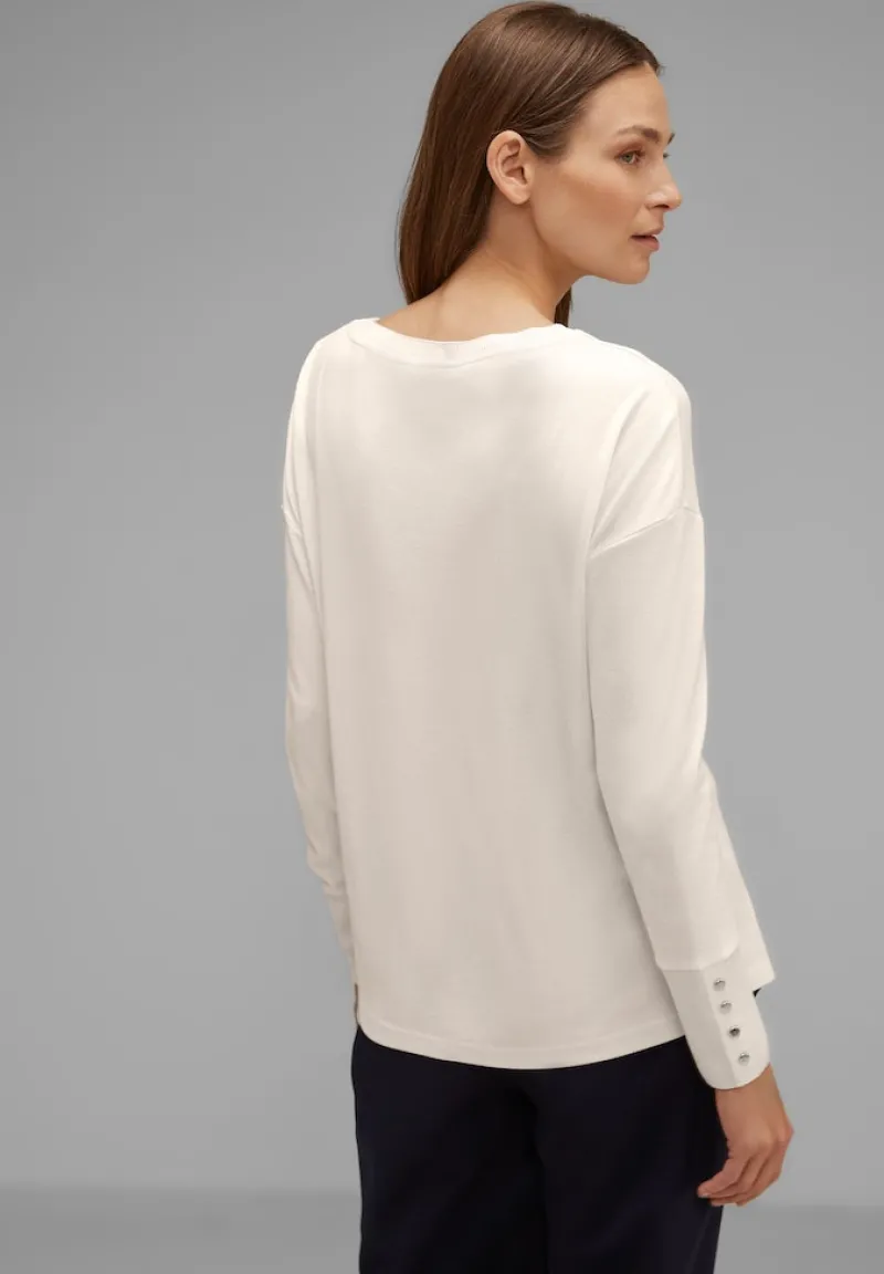 Mit seinem femininen Schnitt und den eleganten Knopfdetails setzt das Shirt modische Akzente. Der klassische Rundhalsausschnitt und die schmalen Ärmel sorgen für einen zeitlosen Look.