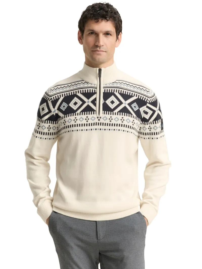 Der Pullover überzeugt durch sein charakteristisches Fair-Isle-Muster, das nicht nur zeitlos schön, sondern auch ein Ausdruck moderner Männermode ist. Die feinen Jacquard-Details sorgen für eine hochwertige Optik. Der halbhohe Reißverschluss am Kragen rundet das Design ab und bietet dir gleichzeitig maximale Flexibilität – offen für entspannte Outfits oder geschlossen als wärmender Begleiter.